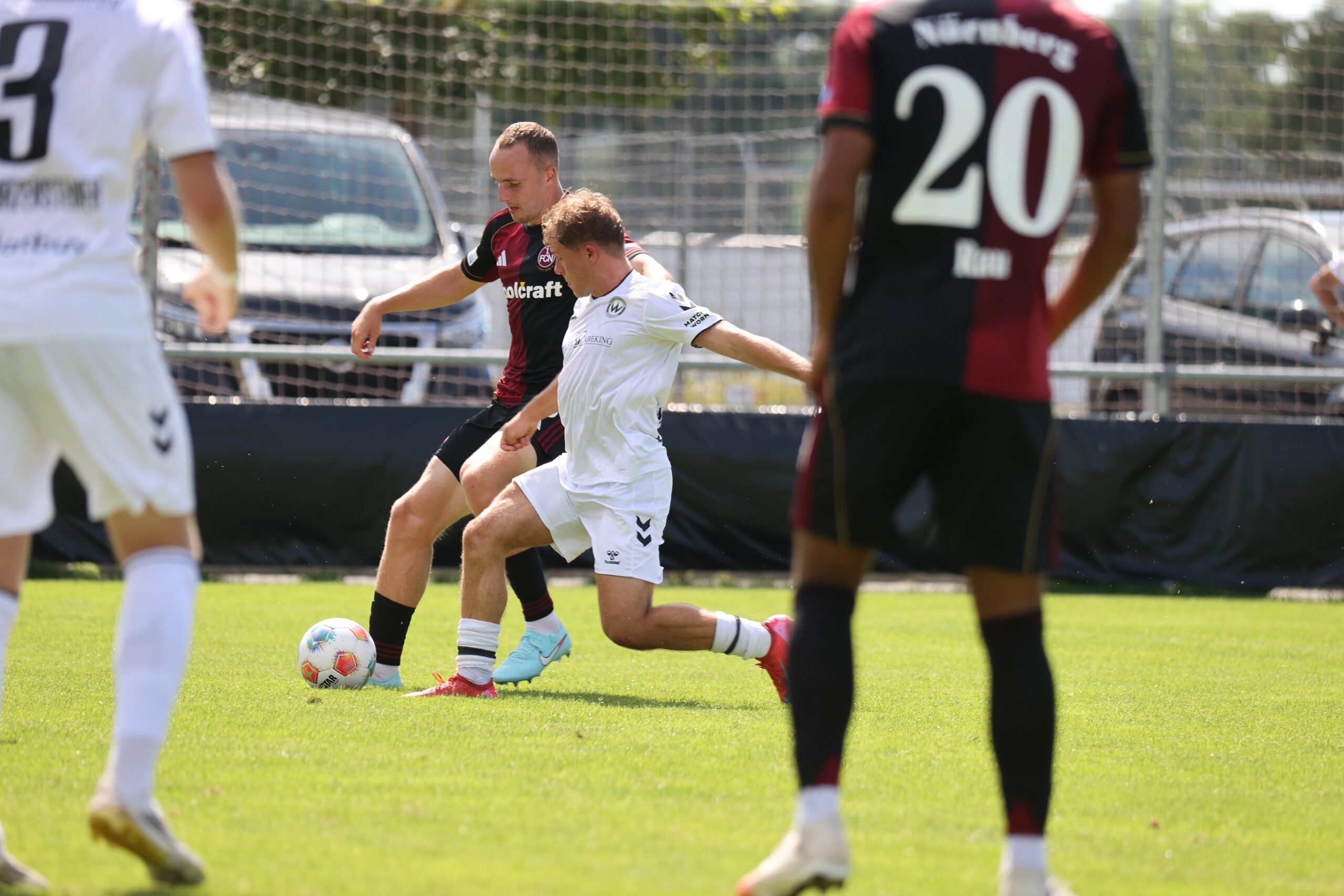 Bei der Begegnung zwischen dem 1. FC Nürnberg II und dem SV Wacker Burghausen trafen zwei Mannschaften aufeinander, die mit zwei Siegen aus zwei Spielen und jeweils ohne Gegentor einen bis dato makellosen Saisonstart hingelegt hatten. Beide Seiten stellten vor den 334 Zuschauern von Beginn an unter Beweis, dass sie trotz hochsommerlicher Temperaturen in Mittelfranken bereit waren, alles für einen Sieg in die Waagschale zu werfen. Die erste Gelegenheit des Spiels hatte SVW-Mittelfeldspieler Denis Ade in der vierten Minute mit einem Distanzschuss für die Salzachstädter. Im direkten Gegenzug hatten dann auch die Mittelfranken eine erste Gelegenheit durch Piet Scobel, dessen Versuch Gäste-Keeper Markus Schöller sicher parieren konnte. Vor allem in den ersten 20 Minuten hatte Burghausen leichte optische Vorteile, während Nürnberg zunächst auf eine stabile Defensive und saubere Umschaltmomente setzte. Einen dieser Momente nutzte fast der gestartete Piet Scobel in der 27. Minute, doch Schöller war erneut auf dem Posten und verhinderte den Rückstand. Sechs Zeigerumdrehungen später war es dann erneut Porstner, der von Eryk Grzywacz mustergültig bedient wurde und dem Burghauser Schlussmann diesmal keine Abwehrchance ließ. Somit ging der 1. FC Nürnberg II in der 32. Minute mit 1:0 in Führung. Kurz vor der Pause kam Christoph Schulz am Strafraum zu einem Distanzschuss, sein Versuch ging jedoch knapp am rechten Pfosten vorbei. Auch Nürnberg hatte vor der Pause noch eine weitere Gelegenheit: Ayoub Chaikhoun scheiterte mit seinem Abschluss aus 18 Metern an der Latte.