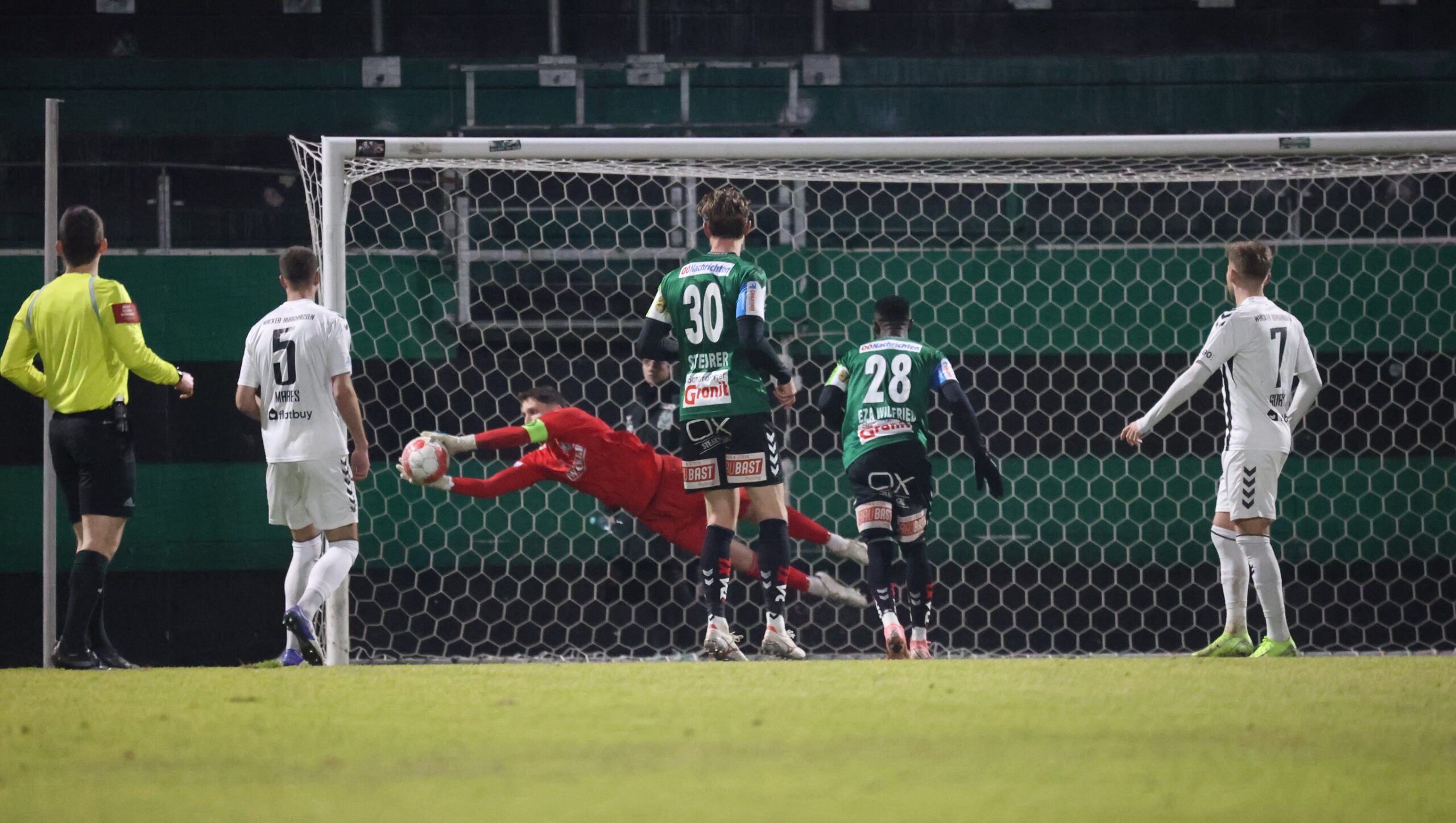 Der SV Wacker Burghausen musste am vergangenen Freitagabend (14. Februar 2025) seine erste Testspielniederlage in der laufenden Wintervorbereitung 2025 hinnehmen. Mit 0:3 unterlagen die Salzachstädter der SV Guntamatic Ried vor rund 350 Zuschauern in der Rieder Innviertel Arena. Bereits in der fünften Spielminute war es SVR-Verteidiger Tobias Steurer, der das Leder nach einem vorausgehenden Freistoß zur 1:0-Führung aus Sicht des österreichischen Zweitligisten über die Linie drückte. Bis zur Pause und auch nach dem Seitenwechsel kontrollierte die Heimelf die Partie weitestgehend, konnte sich jedoch gegen eine immer stabiler werdende Burghauser Defensive keine Großchancen mehr erarbeiten. Erst in der 74. Spielminute wurde es dann wieder gefährlich: Nach einer Gäste-Freistoßmöglichkeit, die zunächst zur Ecke geklärt werden konnte, konterten die Hausherren im eigenen Stadion. Der südafrikanische Rechtsaußen Antonio Van Wyk trieb den Ball aus der eigenen in die Burghauser Hälfte und setzte den mitgelaufenen Oliver Steurer in Szene. SVW-Keeper Markus Schöller verhinderte den Steurer-Doppelpack mit einem starken Reflex. In der 82. Spielminute war es dann aber soweit, als Angreifer Wilfried Eza nach einem schnell ausgeführten Freistoß und einer Unachtsamkeit in der Burghauser Verteidigung zum 2:0 vollendete und die Partie damit entschied. Den Schlusspunkt der Partie setzte Philipp Pomer, der den Spielstand in der ersten Minute der Nachspielzeit mit einem satten Distanzschuss auf 3:0 erhöhte.