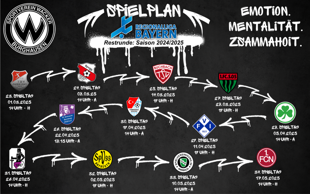 Sieben Heimspiele und fünf Auswärtsspiele! Am Samstag, den 01. März 2025 startet der SV Wacker Burghausen um 14 Uhr vor heimischer Kulisse in der Wacker-Arena gegen den Tabellennachbarn TSV Aubstadt in die Regionalliga Bayern-Restrunde der Saison 2024/2025. Tickets für das erste Ligaspiel nach der Winterpause sind bereits im Online-Shop verfügbar (-> zum Ticketshop)! Nach 22 absolvierten Partien befinden sich die Salzachstädter mit 30 Punkten sowie 33:32 Toren auf dem achten Tabellenplatz und damit – bei einem absolvierten Spiel mehr – zwei Punkte vor den Aubstädtern. Offen ist jedoch noch das finale Urteil hinsichtlich der Spielwertung gegen den TSV Schwaben Augsburg aus dem Oktober, das nach dem Einspruch der Schwabenritter noch nicht final entschieden wurde (-> zum ausführlichen Bericht). Der TSV Schwaben Augsburg legte daraufhin Einspruch gegen dieses Urteil ein, weshalb das Verfahren aktuell noch offen und nicht final abgeschlossen ist. Die Restrunde hat einige sportliche Highlights parat: In der Wacker-Arena gastieren neben dem TSV Aubstadt auch noch der TSV Buchbach (14. März 2025), der Tabellenführer 1. FC Schweinfurt 05 (28. März 2025), der FV Illertissen (11. April 2025), der TSV Schwaben Augsburg (26. April 2025), die SpVgg Bayreuth (02. Mai 2025) und der 1. FC Nürnberg II (17. Mai 2025).
