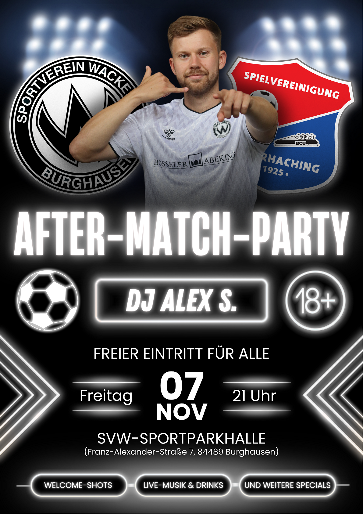 Und damit nicht genug: Unmittelbar im Anschluss an die Begegnung (ab ca. 21 Uhr) steigt dann die große After-Match-Party in der SVW-Sportparkhalle. Dabei haben alle Besucher (Eintritt nur ab 18 Jahren) freien Eintritt und dürfen sich auf eine unvergessliche Nacht mit Welcome-Shots (nur solange der Vorrat reicht), Live-Musik & Drinks sowie vielen weiteren Specials freuen. Den Sound für die After-Match-Party bringt kein Geringerer als DJ Alex S.: laut, tanzbar, regional bekannt und garantiert nie langweilig! Er mixt, was Spaß macht und die Menge tanzen lässt. Also: Wer feiern will, ist hier genau richtig!