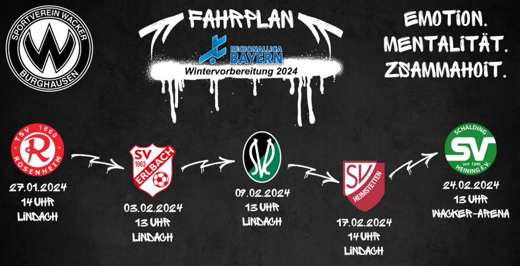 Den Startschuss gibt das Heimspiel gegen den Landesligisten TSV 1860 Rosenheim am Samstag, den 27. Januar 2024. Anstoß der Begegnung gegen die Innstädter, die seit dem Beginn der laufenden Spielzeit vom ehemaligen SVW-Coach Wolfgang Schellenberg trainiert werden, ist um 14 Uhr. Eine Woche später (03. Februar 2024 / 13 Uhr) empfängt die Berg-Elf dann mit dem SV Erlbach den derzeitigen Tabellensechsten der Bayernliga Süd. Am darauffolgenden Freitagnachmittag, den 09. Februar 2024 gastiert um 13 Uhr der österreichische Bundesligaabsteiger SV Ried an der Salzachstadt. Mit dem SV Heimstetten trifft man am Samstag, den 17. Februar 2024 um 14 Uhr ebenfalls zuhause auf einen ehemaligen Regionalliga-Konkurrenten, der aktuell in der Bayernliga Süd um den Wiederaufstieg kämpft. Alle vier Testspiele werden auf der Sportanlage im Waldpark Lindach ausgetragen. Die Wintervorbereitung schließt in der Folge eine Woche (24. Februar 2024 um 13 Uhr) vor der ersten Ligapartie mit einem Testspiel gegen den Regionalligakonkurrenten SV Schalding-Heining ab. Die Generalprobe findet voraussichtlich auf dem Hauptplatz in der Wacker-Arena statt.